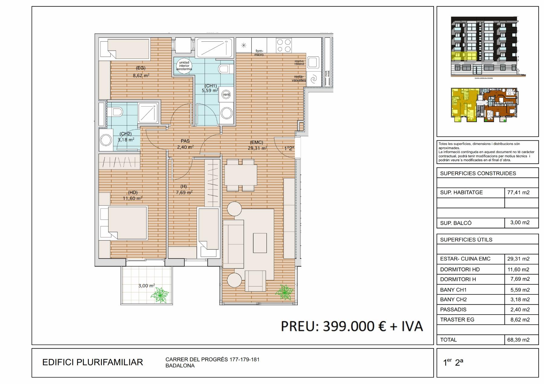 - Primero 2ª de 77,41m2 de 3 habitaciones y 2 baños por 395.000 euros + IVA